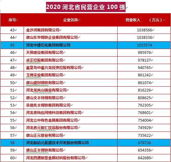 新啟元公司訊(通訊員 王世明)9月25日,河北省民營(yíng)企業(yè)百?gòu)?qiáng)暨民營(yíng)企業(yè)社會(huì)責(zé)任報(bào)告發(fā)布會(huì)上,河北省工商聯(lián)發(fā)布了2020年河北省民營(yíng)企業(yè)100強(qiáng)榜單、制造業(yè)100強(qiáng)榜單、服務(wù)業(yè)100強(qiáng)榜單。河北中捷石化集團(tuán)有限公司、河北新啟元能源技術(shù)開發(fā)股份有限公司榜上有名。
